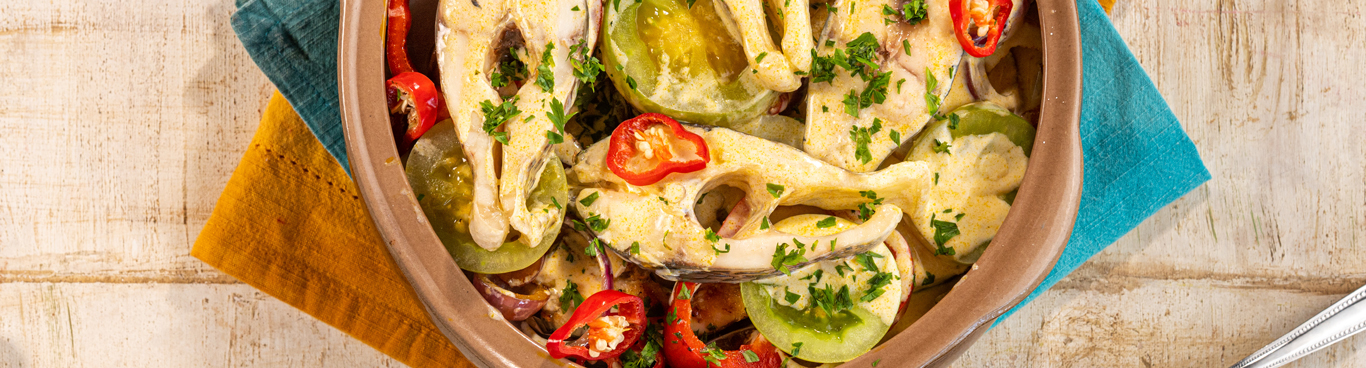 Moqueca de postas de tilápia com tomate verde e farofinha de azeite de dendê